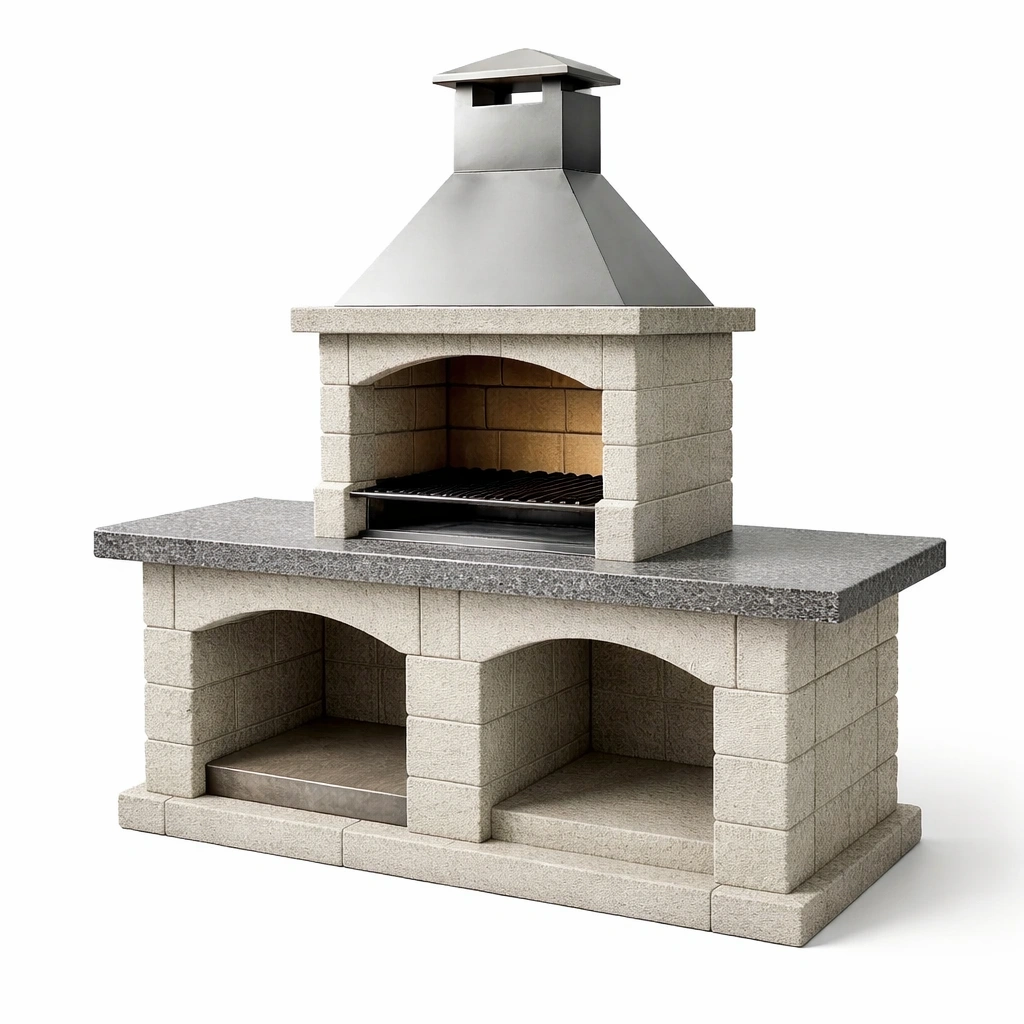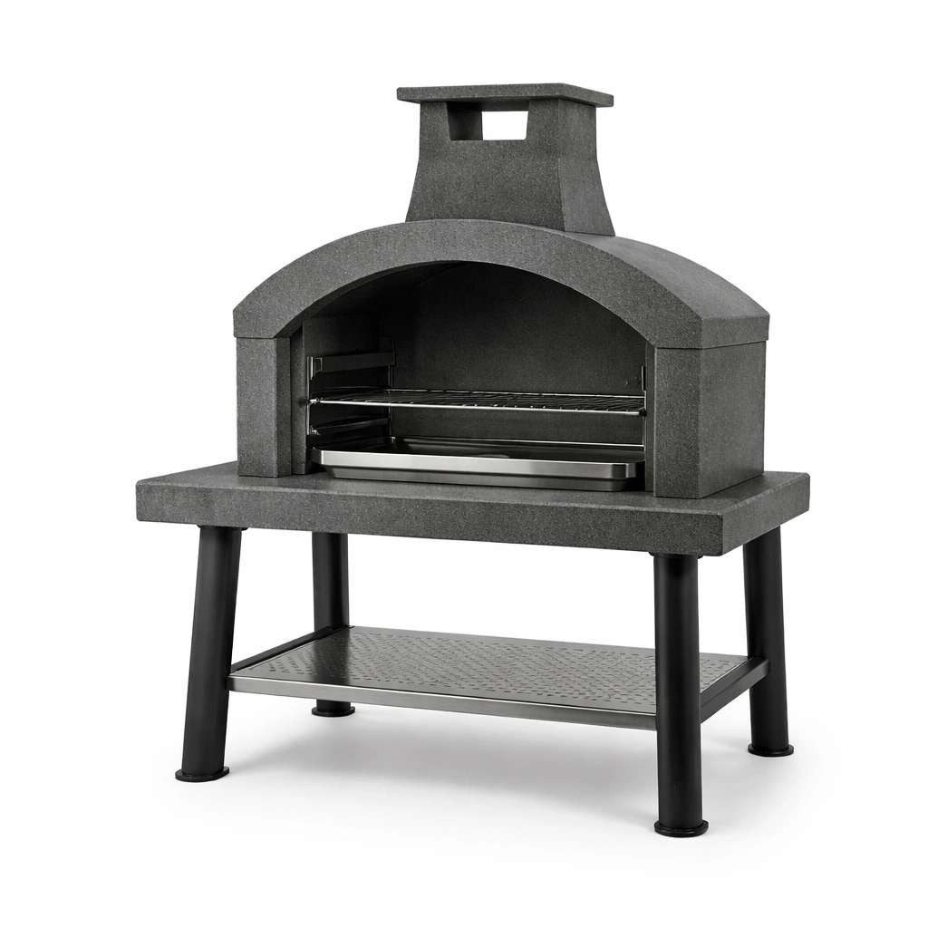 Barbecue forno a legna in metallo grigio con ripiano e camino