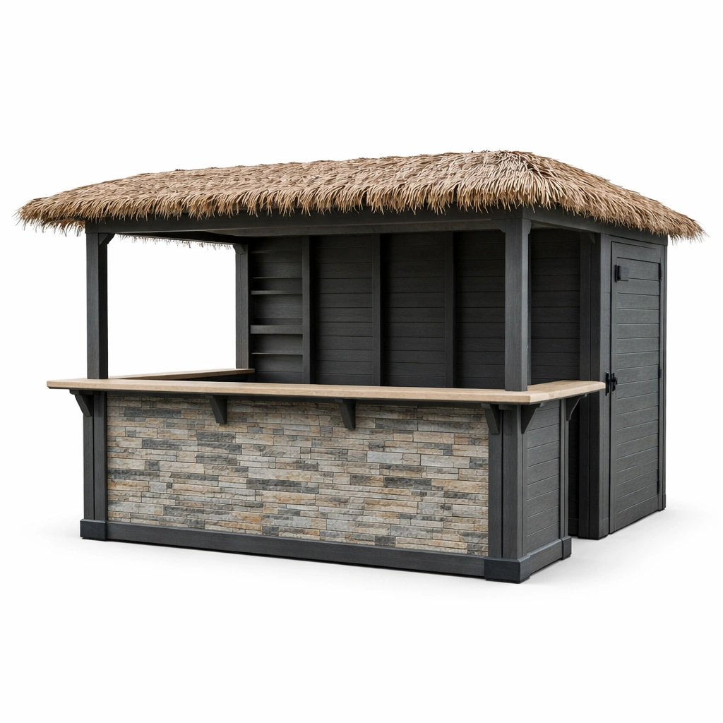 Padiglione bar esterno con tetto in paglia sintetica e rivestimento in pietra