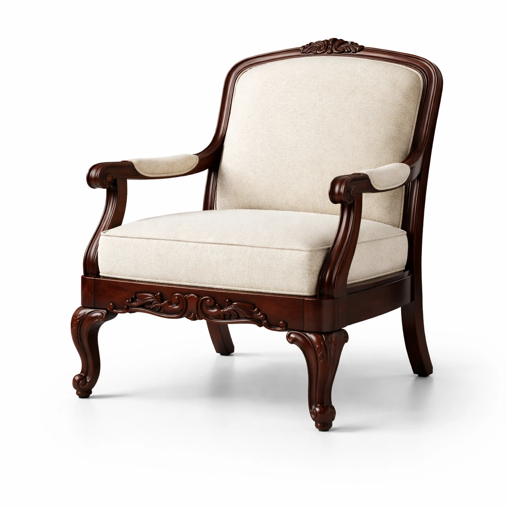 Poltrona in legno con rivestimento in tessuto beige