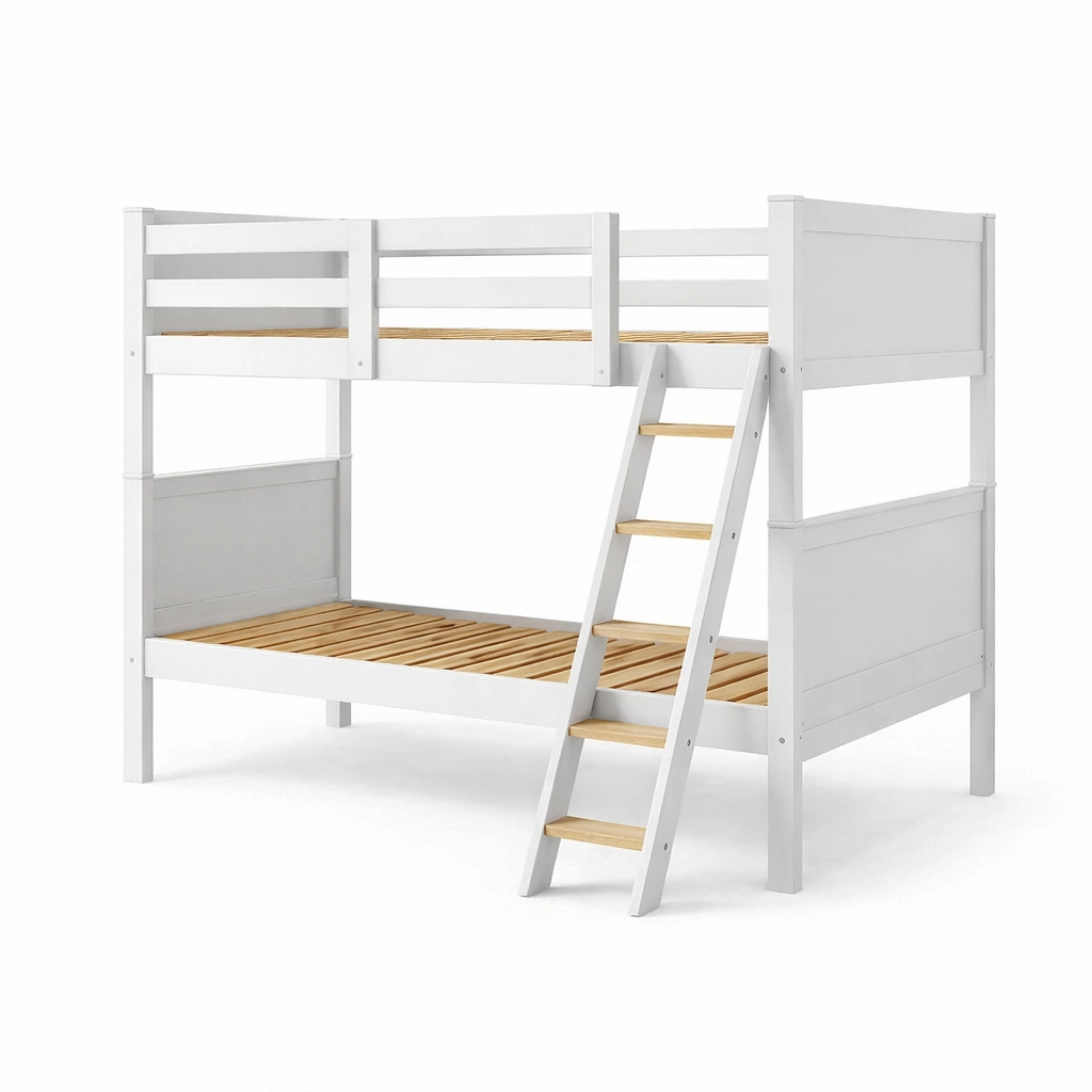 Letto a castello realizzato in legno di pino con finitura bianca. Presenta una struttura robusta con barre di sicurezza e una scala integrata per l'accesso al letto superiore. Capacità di carico per ciascun letto: 100 kg.